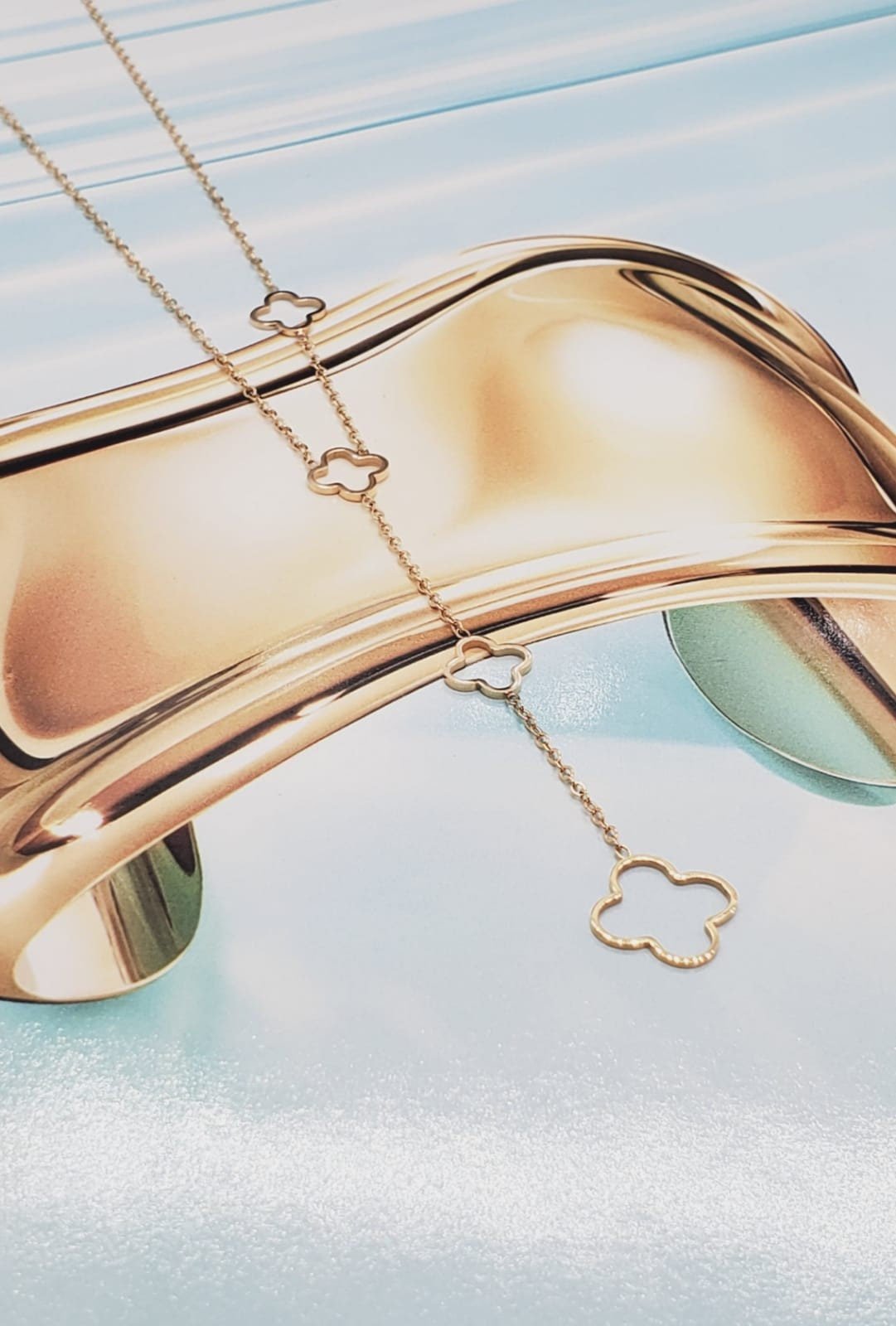 Fun and elegant four leaf clover necklace in the lariat style featuring open clover stations and a larger dangling open clover at the end. The stations are connected by an open link chain and the entire necklace is plated in 14kt gold.