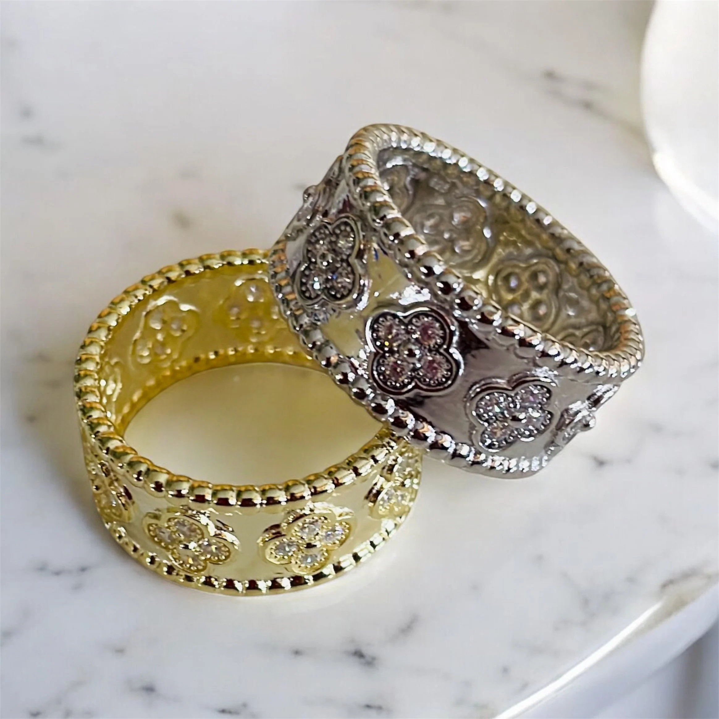 14kt Gold plated clover style rings feature beaded edges and a rounded design with an inlaid gemstone, delicately finished by a beaded design. The ring reverses to an all gold sunray design anchored by a cubic zirconia.